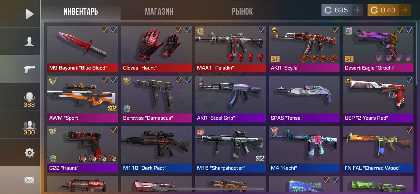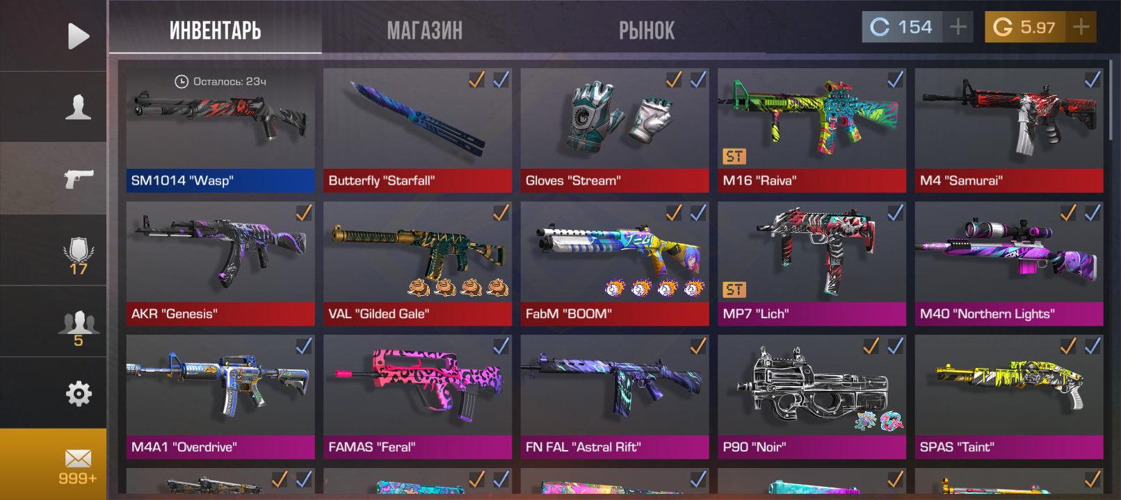 💰Голда: 15.27; 🧤Перчатки: 2 🔪Ножи: 2; ⭐️Редкие скины: 9