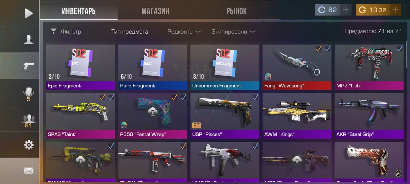 💰Голда: 13.32; 💎Кредиты: 62; 🔪Ножи: Fang "Wavesong" ⭐️Редкие скины: 4